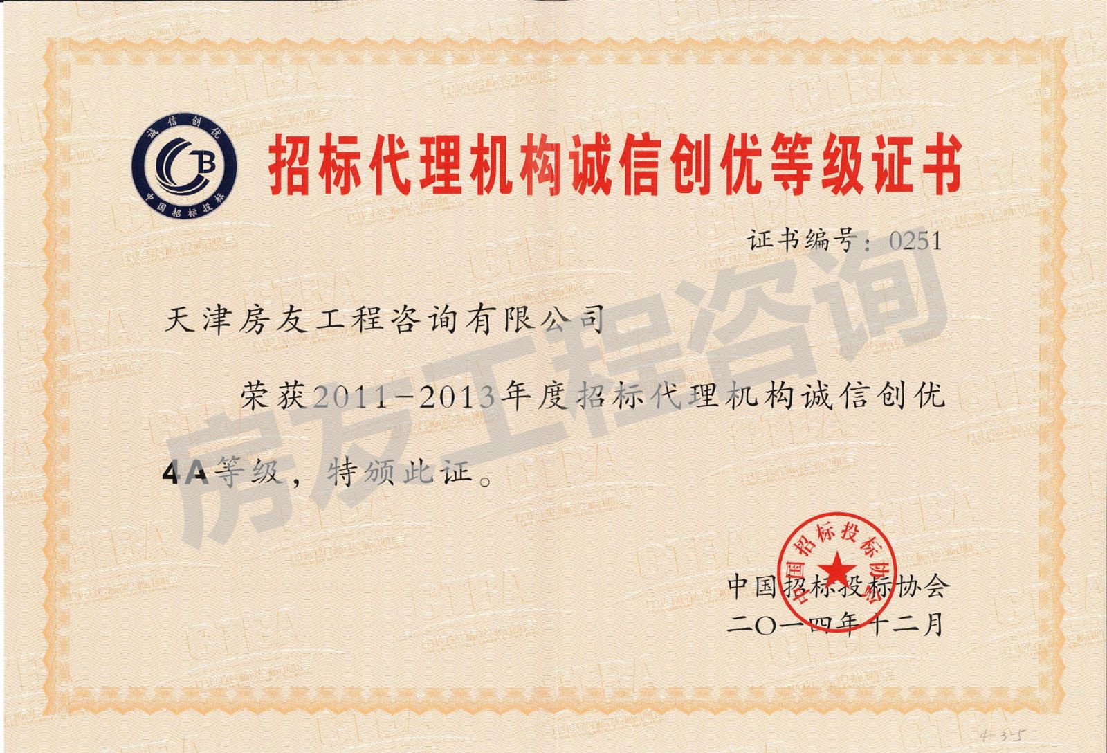 2014年12月28日,中國(guó)招標(biāo)投標(biāo)協(xié)會(huì)在北京召開了2014年招標(biāo)代理機(jī)構(gòu)誠(chéng)信創(chuàng)優(yōu)總結(jié)大會(huì),全國(guó)各地共計(jì)388家招標(biāo)代理公司分獲5A、4A、3A等級(jí)“招標(biāo)代理機(jī)構(gòu)誠(chéng)信創(chuàng)優(yōu)先進(jìn)單位”稱號(hào),房友咨詢連續(xù)兩屆榮獲此榮譽(yù)稱號(hào)。