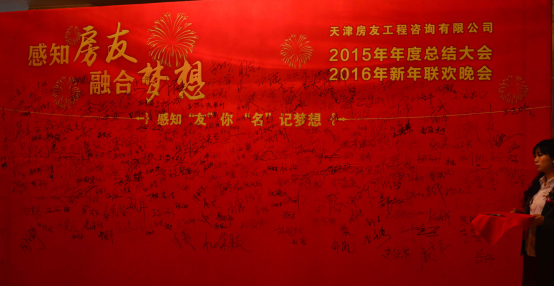 2016年01月29日13:00(星期五)天津房友工程咨詢有限公司2015年年度總結(jié)大會(huì)暨2016年新年聯(lián)歡會(huì)在泰達(dá)會(huì)館(開發(fā)區(qū)黃海路與第二大街交口)五樓會(huì)議室召開,公司全體員工出席。