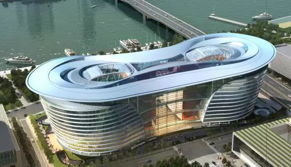 屋蓋的整體造型呈∞形,型狀奇特,最高處達(dá)62m,逐漸遞減至端部懸挑結(jié)構(gòu)。為了滿足建筑造型與受力合理性的要求,采用雙向桁架體系,將兩個(gè)塔樓連接為整體,利用八個(gè)核心筒和內(nèi)環(huán)框架柱作為豎向支撐,使大跨度懸挑屋蓋形成穩(wěn)定的連體結(jié)構(gòu),充分展示了屋蓋流線型多曲面設(shè)計(jì),屋脊多而又不失層次分明,南北完美對(duì)稱,可自由開啟,顯得科技感十足。