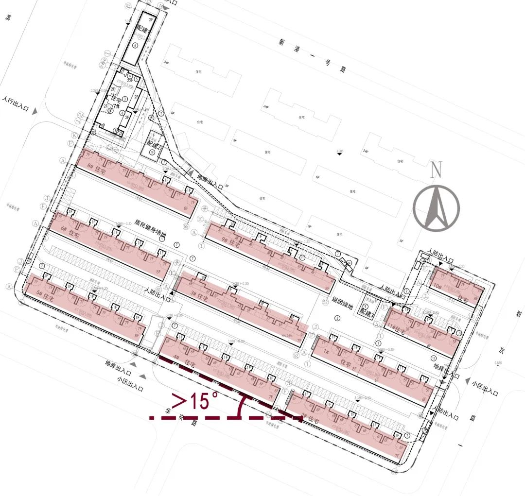 此項(xiàng)目洋房布置角度大于15°,根據(jù)天津市城市規(guī)劃管理規(guī)定要求,可以減小建筑間距,從而增大洋房密度及洋房比例,增加單平米銷(xiāo)售價(jià)格,但犧牲全天日照時(shí)長(zhǎng)。