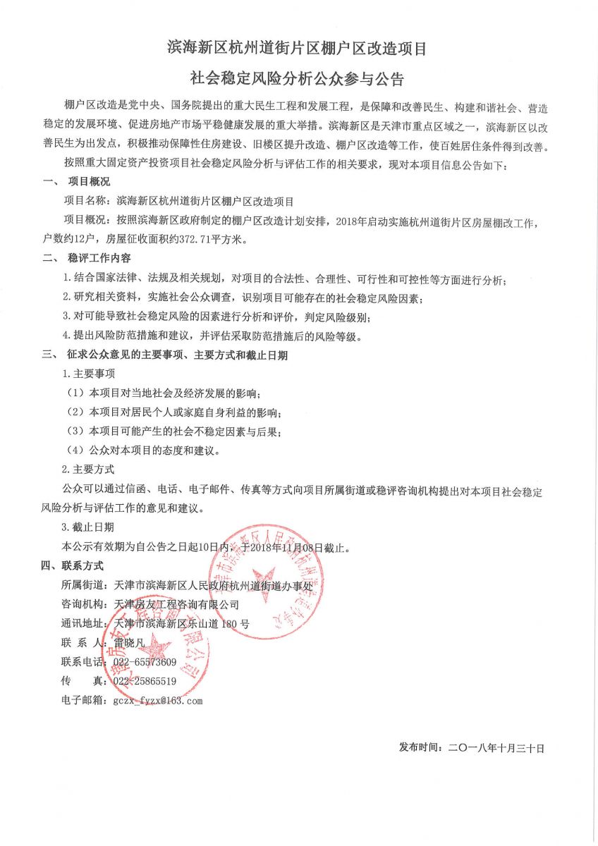 濱海新區(qū)杭州道街片區(qū)棚戶區(qū)改造項(xiàng)目社會(huì)穩(wěn)定風(fēng)險(xiǎn)分析公眾參與公告