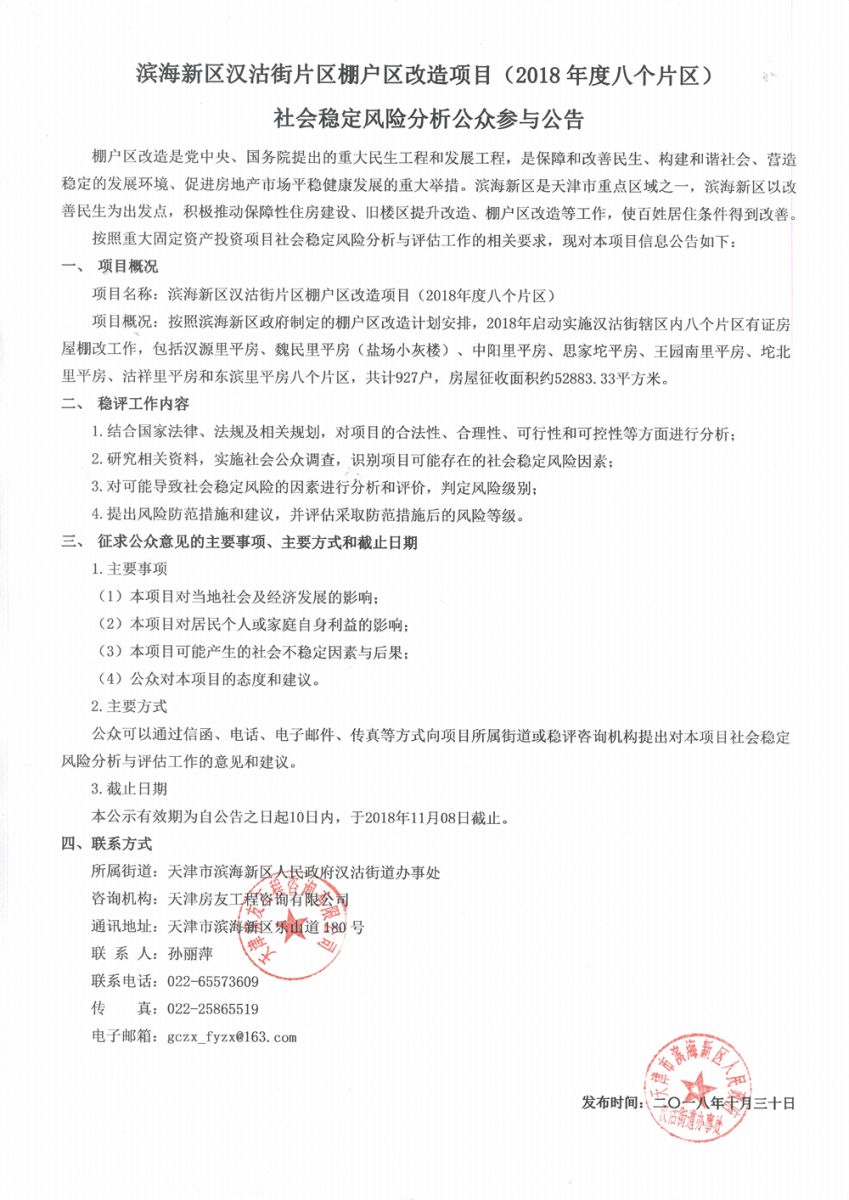 濱海新區(qū)漢沽街片區(qū)棚戶區(qū)改造項(xiàng)目(2018年度八個(gè)片區(qū))社會(huì)穩(wěn)定風(fēng)險(xiǎn)分析公眾參與公告