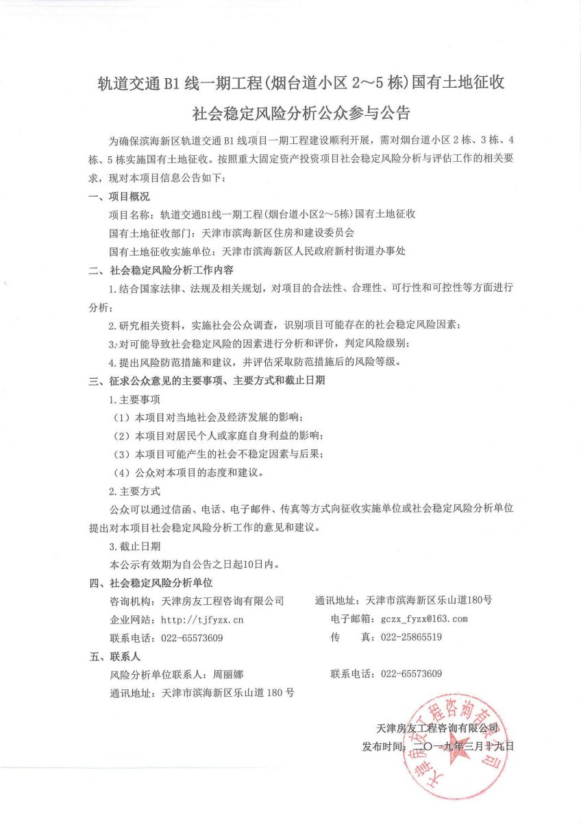 軌道交通B1線一期工程(煙臺(tái)道小區(qū)2~5棟)國(guó)有土地征收社會(huì)穩(wěn)定風(fēng)險(xiǎn)分析公眾參與公告