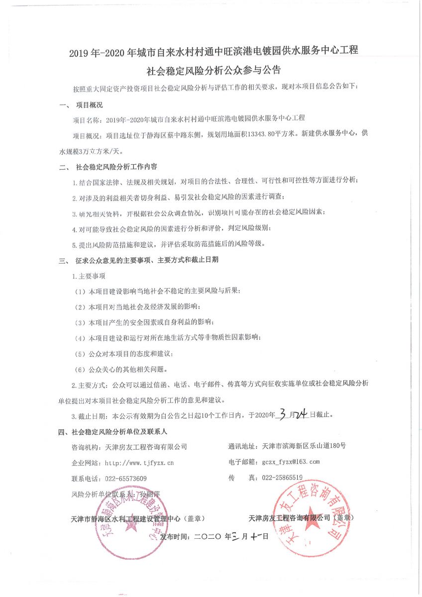 2019年-2020年城市自來(lái)水村村通中旺濱港電鍍園供水服務(wù)中心工程社會(huì)穩(wěn)定風(fēng)險(xiǎn)分析公眾參與公告