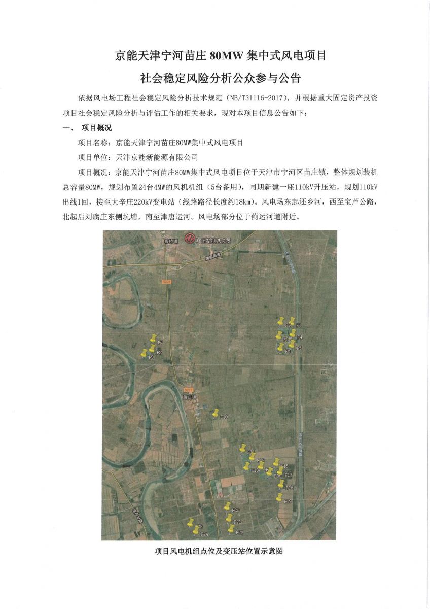 京能天津?qū)幒用缜f80MW集中式風(fēng)電項(xiàng)目社會(huì)穩(wěn)定風(fēng)險(xiǎn)分析公眾參與公告