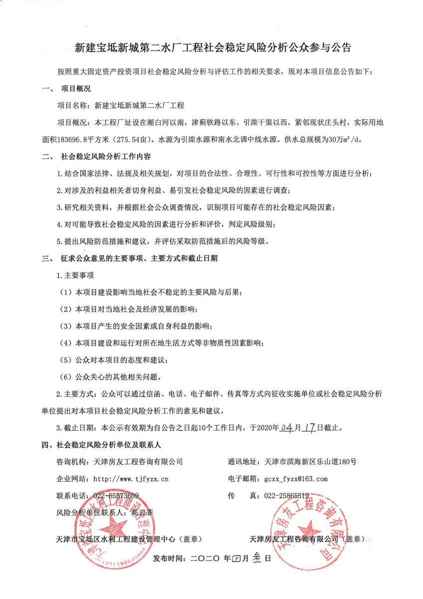 新建寶坻新城第二水廠工程社會穩(wěn)定風(fēng)險分析公眾參與公告