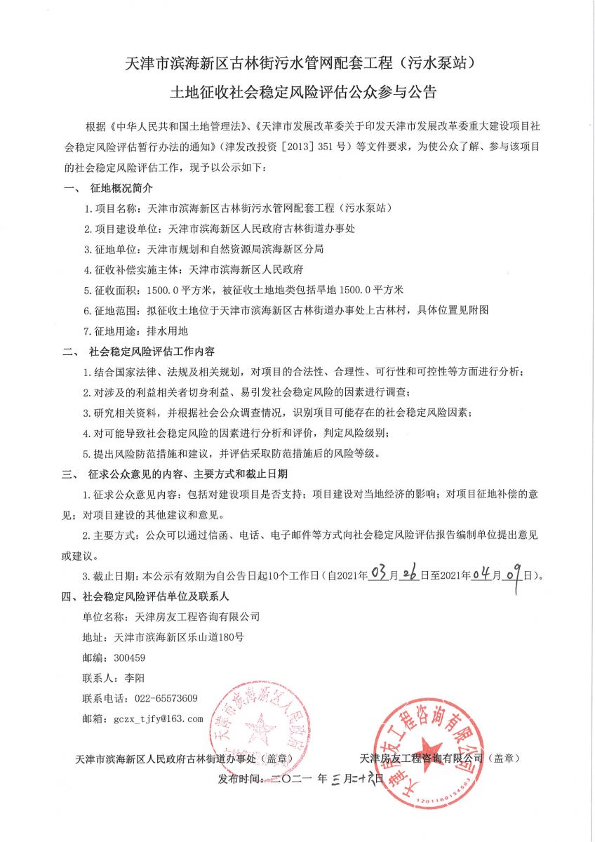 天津市濱海新區(qū)古林街污水管網配套工程(污水泵站)土地征收社會穩(wěn)定風險評估公眾參與公告