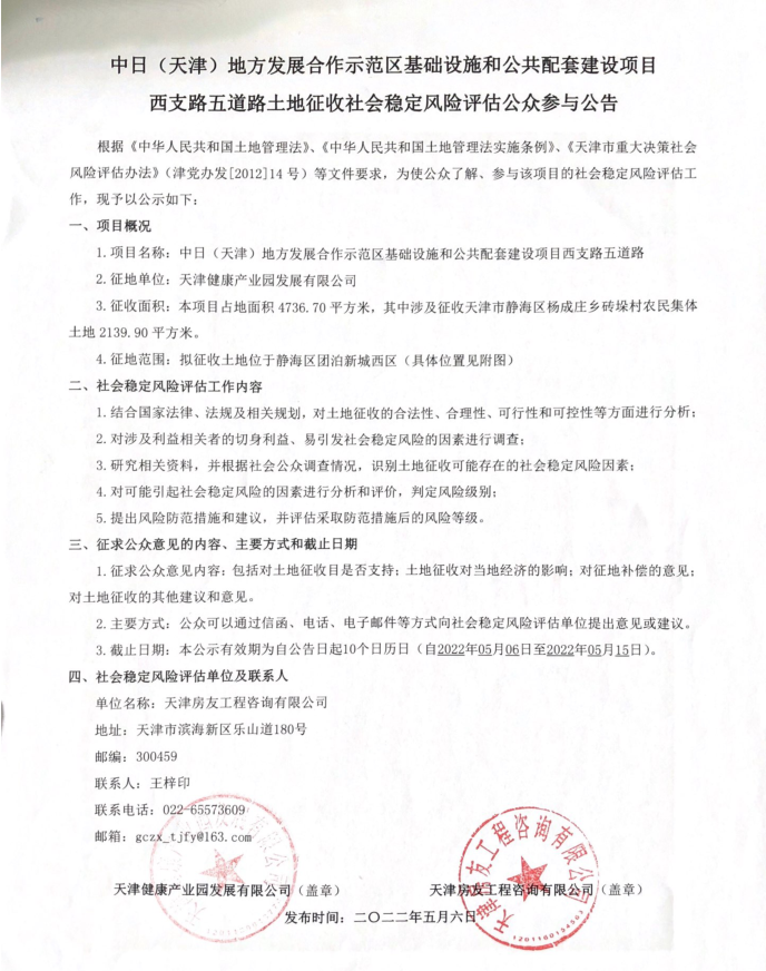 中日(天津)地方發(fā)展合作示范區(qū)基礎(chǔ)設(shè)計(jì)和公共配套建設(shè)項(xiàng)目西支路五道路土地征收社會(huì)穩(wěn)定風(fēng)險(xiǎn)評(píng)估公眾參與公告