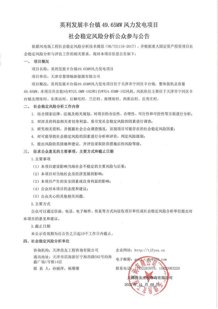 英利發(fā)展豐臺(tái)鎮(zhèn)49.65MW風(fēng)力發(fā)電項(xiàng)目社會(huì)穩(wěn)定風(fēng)險(xiǎn)分析公眾參與公告