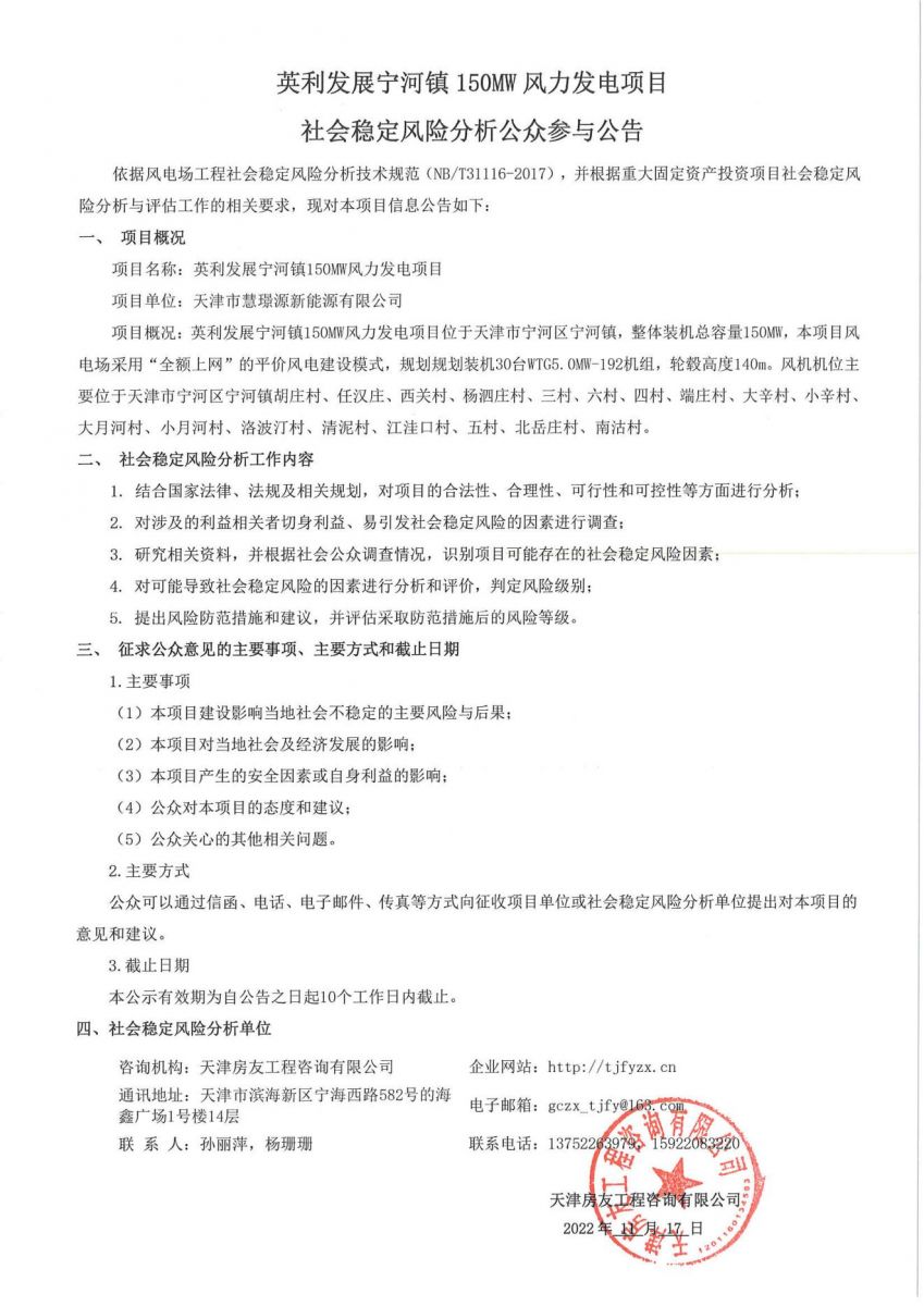 英利發(fā)展寧河鎮(zhèn)150MW風(fēng)力發(fā)電項目社會穩(wěn)定風(fēng)險分析公眾參與公告