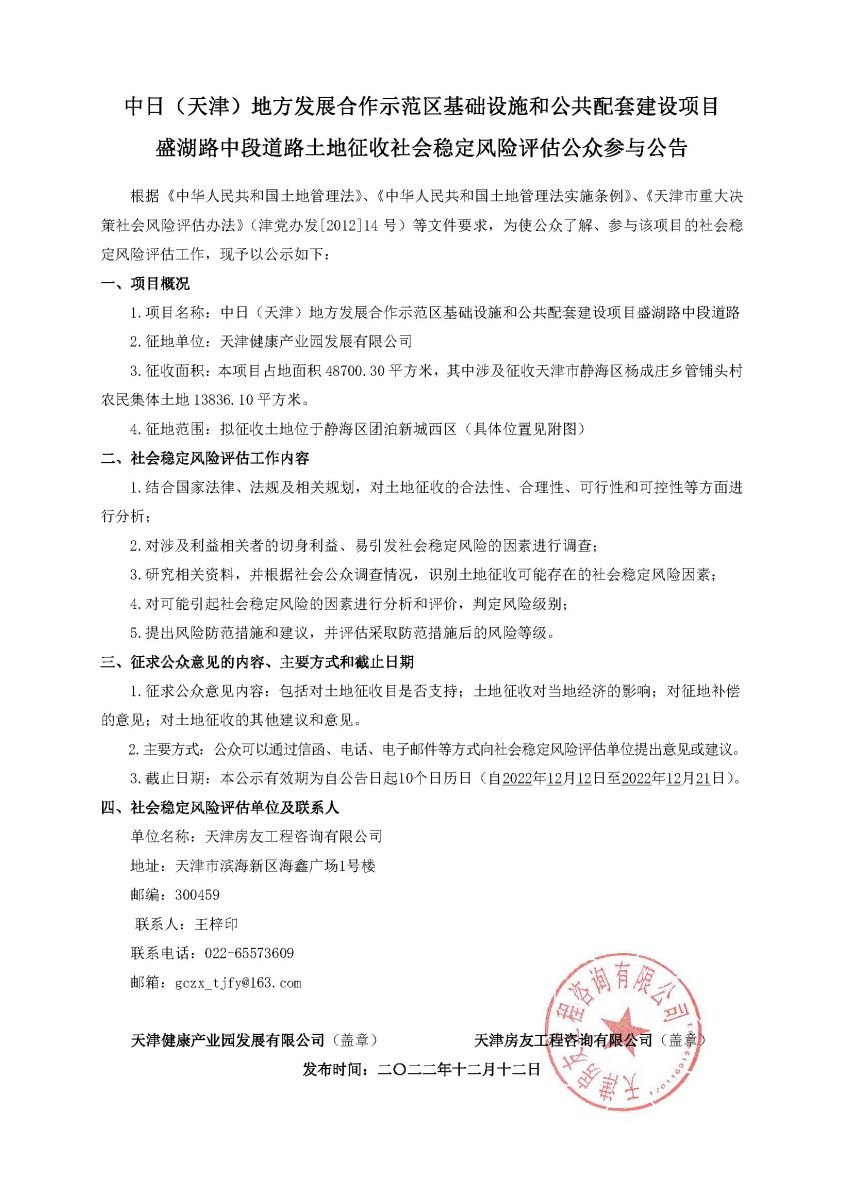 中日(天津)地方發(fā)展合作示范區(qū)基礎(chǔ)設(shè)施和公共配套建設(shè)項(xiàng)目盛湖路中段道路土地征收社會(huì)穩(wěn)定風(fēng)險(xiǎn)評估公眾參與公告