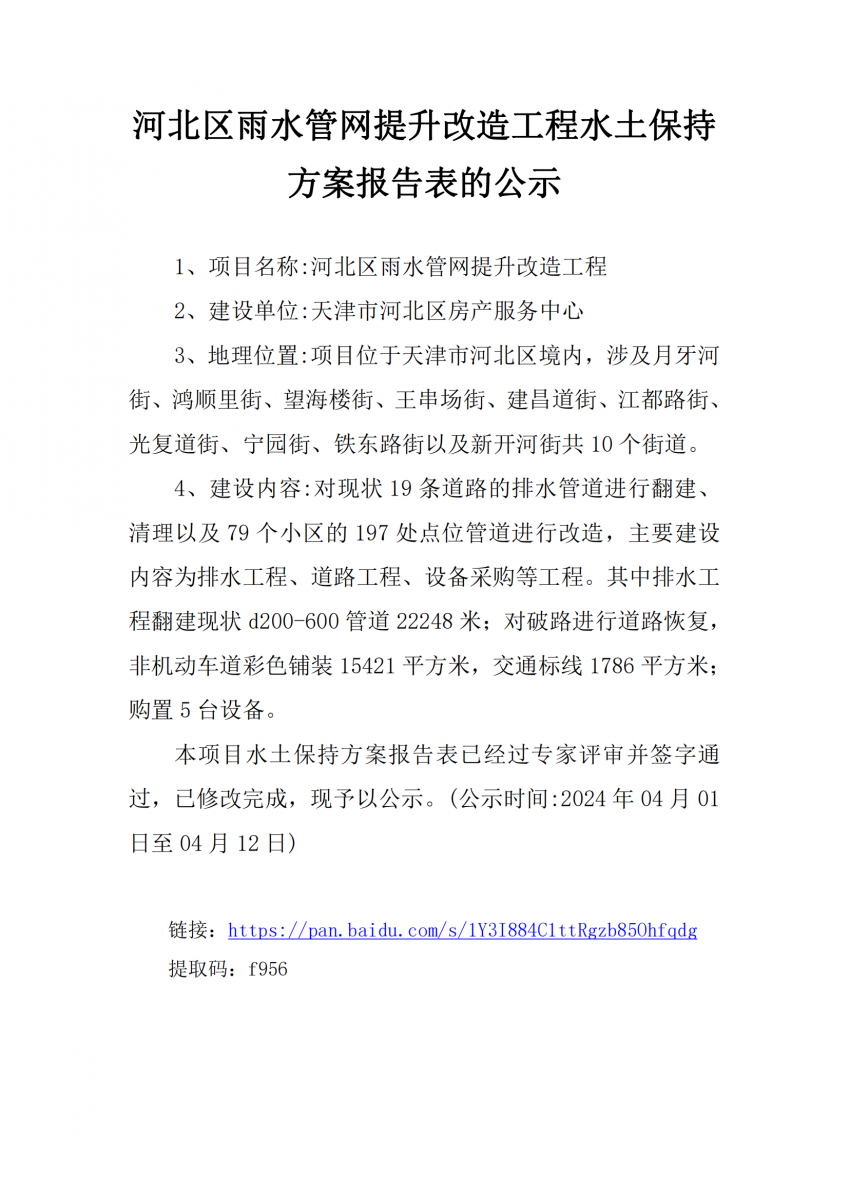河北區(qū)雨水管網(wǎng)提升改造工程水土保持方案報告表的公示