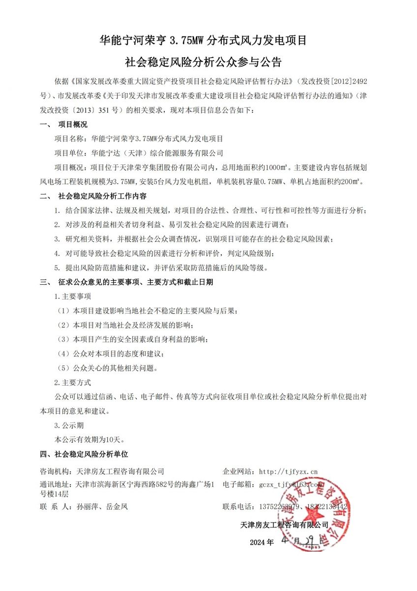 華能寧河榮亨3.75MW分布式風力發(fā)電項目社會穩(wěn)定風險分析公眾參與公告