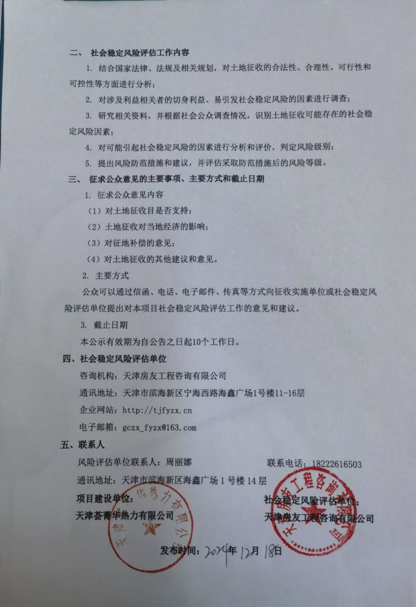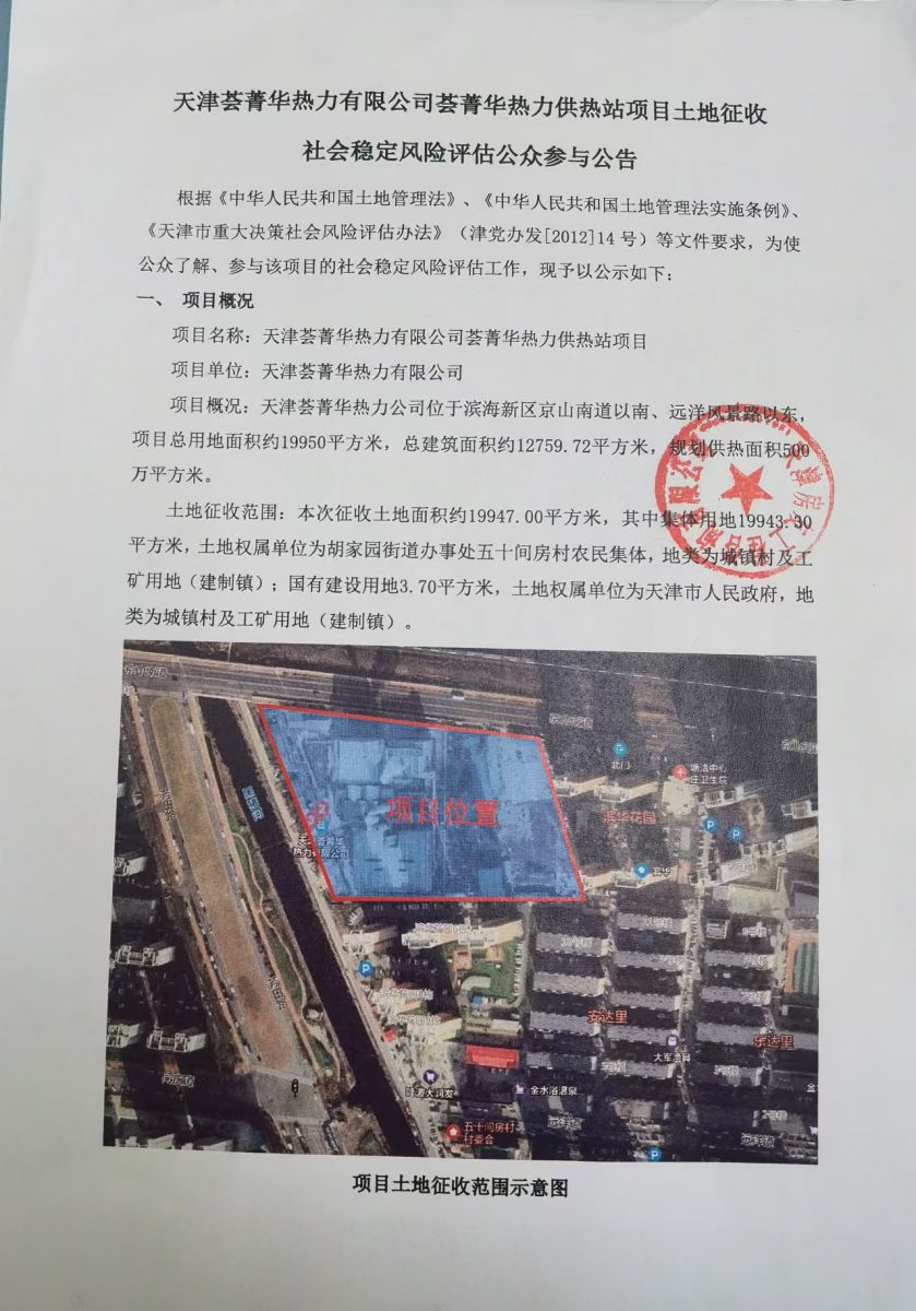天津薈菁華熱力有限公司薈菁華熱力供熱站項目土地征收社會穩(wěn)定風險評估公眾參與公告